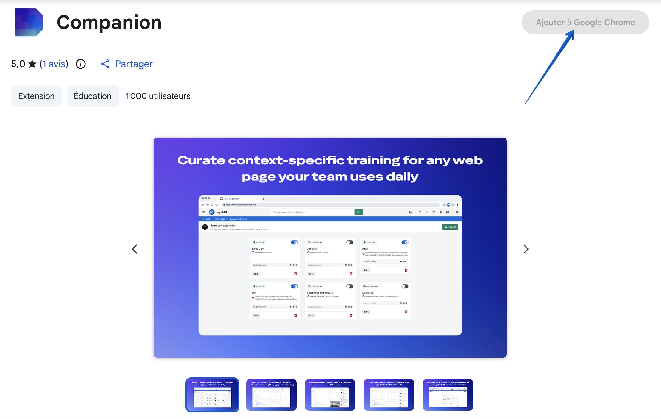 Sur la page de Docebo Companion, appuyez sur le bouton Ajouter à Chrome pour installer l’extension.
