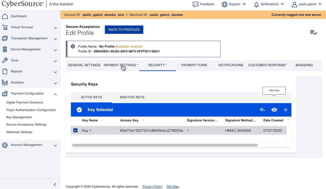 At the end of the creation procedure, Cybersource will show you the Secret Key and the Access Key needed to configure the integration between Docebo and Cybersource. At any time, you can access these keys by selecting the key with the corresponding checkboxes and clicking on the eye icon. Keys have a 2-year validity period.
