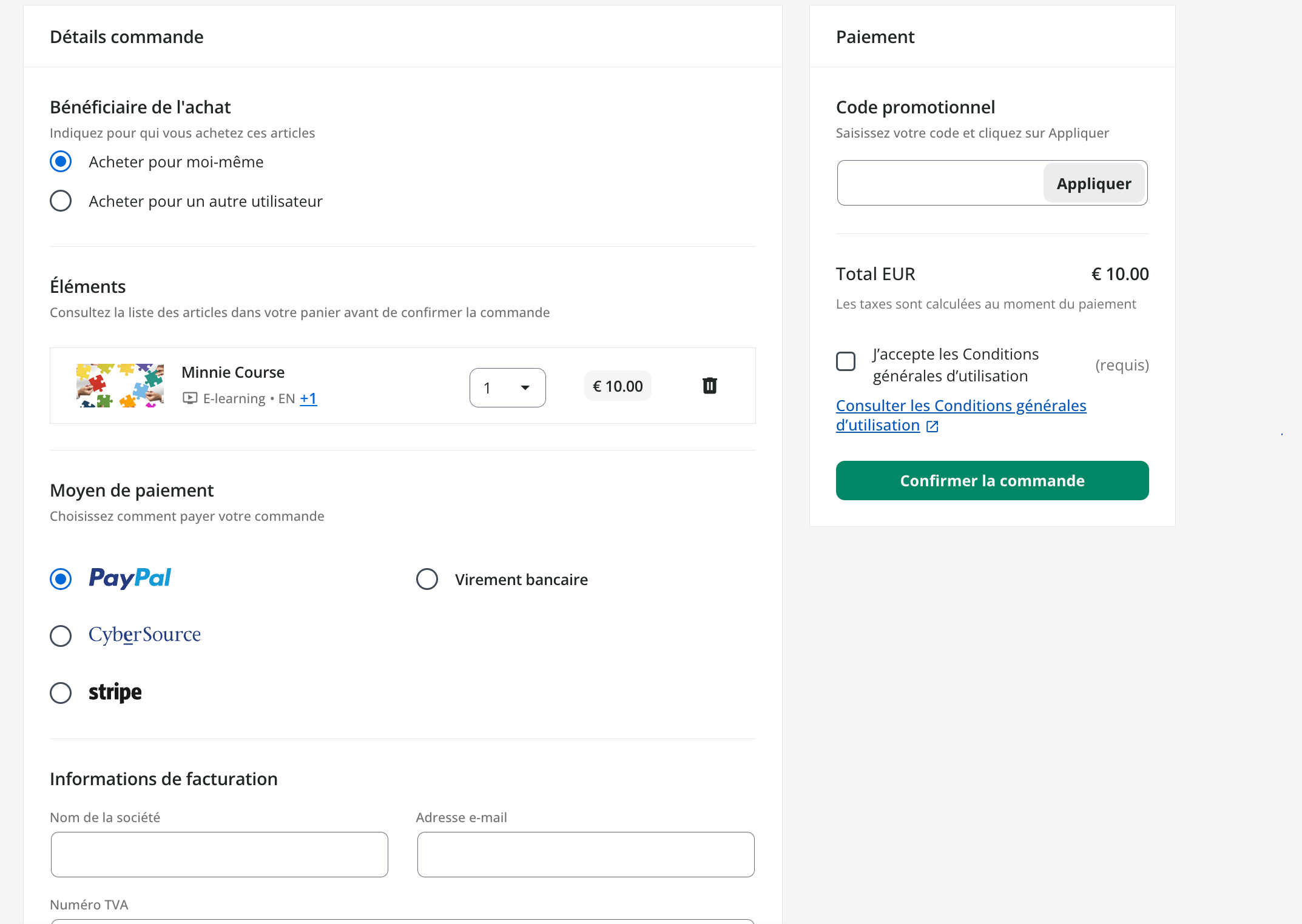 Lorsque vous êtes prêt à procéder à votre achat, dans la section Paiement, cochez la case permettant d’accepter les conditions générales et cliquez sur Confirmer la commande. À partir de là, les étapes suivantes diffèrent selon le mode de paiement choisi : Paiement électronique, ou Virement bancaire.