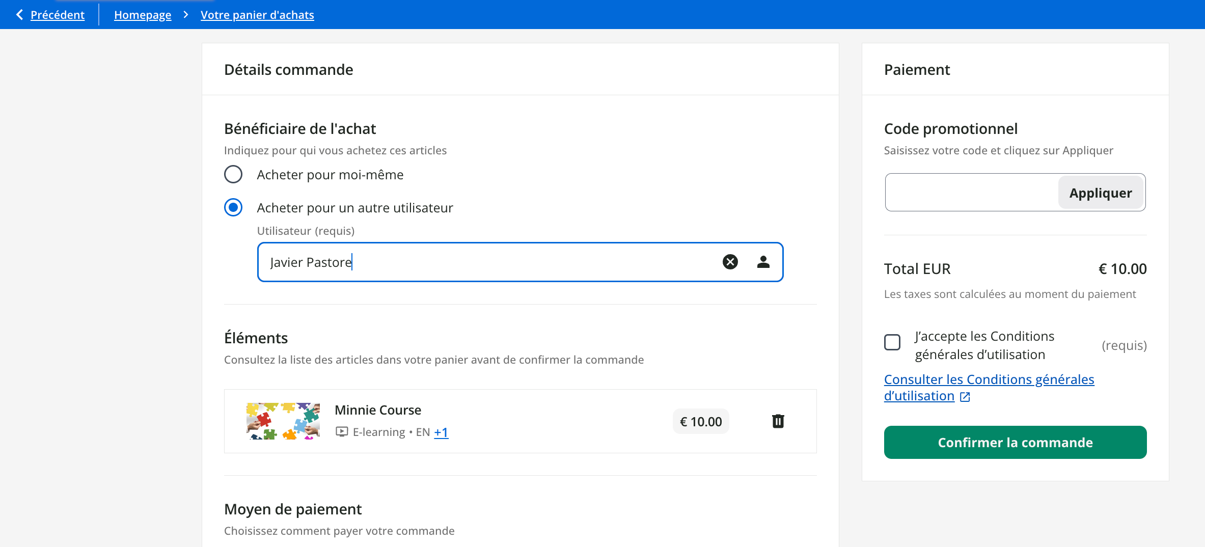 Si vous disposez des droits requis, dans le panier, vous verrez l'option Bénéficiaire de l'achat, où vous pouvez choisir d'acheter les articles de votre panier pour vous-même, ou pour quelqu'un d'autre. Gardez en tête qu'avec cette dernière méthode, tous les articles de votre panier seront achetés pour l'utilisateur sélectionné.