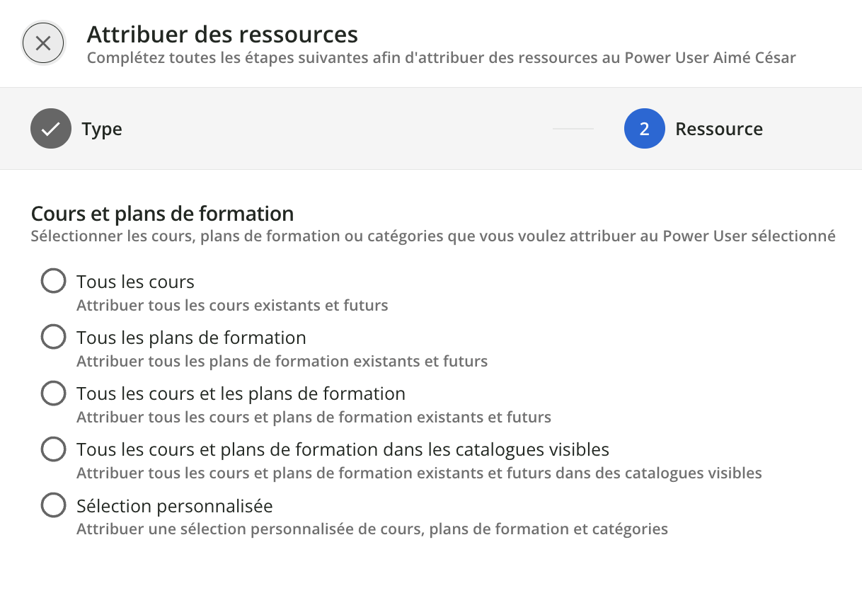 Lorsque vous assignez des cours et des plans de formation comme ressource à un Power User, vous pouvez soit faire une Sélection personnalisée (ce qui signifie que vous choisissez individuellement les articles à assigner) soit sélectionner l'une des options "Tous", qui assignent au Power User tout le contenu existant et futur du type spécifié (cours, plans de formation, ou les deux).