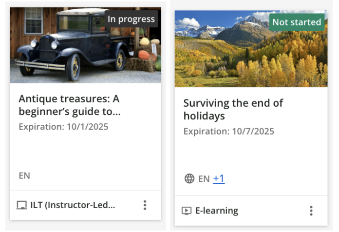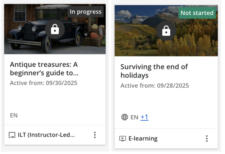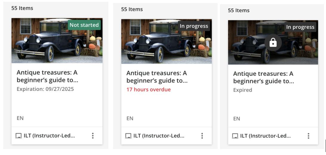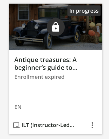 Une fois le nombre de jours après la fin de la dernière session écoulé, la carte du cours ILT sera verrouillée pour l’apprenant et affichera la mention Inscription expirée.