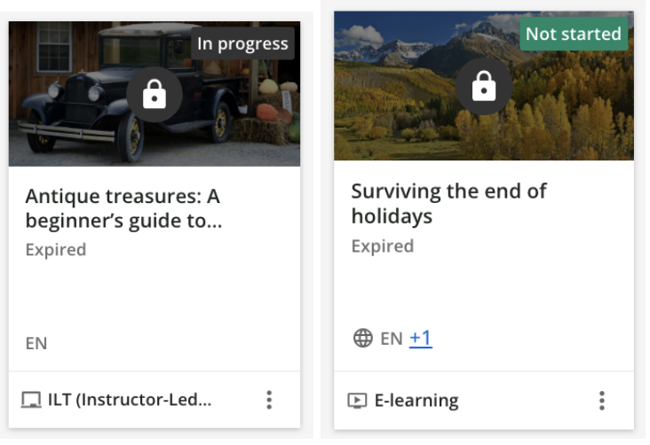 - Une fois que l'apprenant a perdu l’accès au cours (sur la base des Options temporelles du cours, et non des dates de l'apprenant), la carte est verrouillée et marqué du statut Expiré.