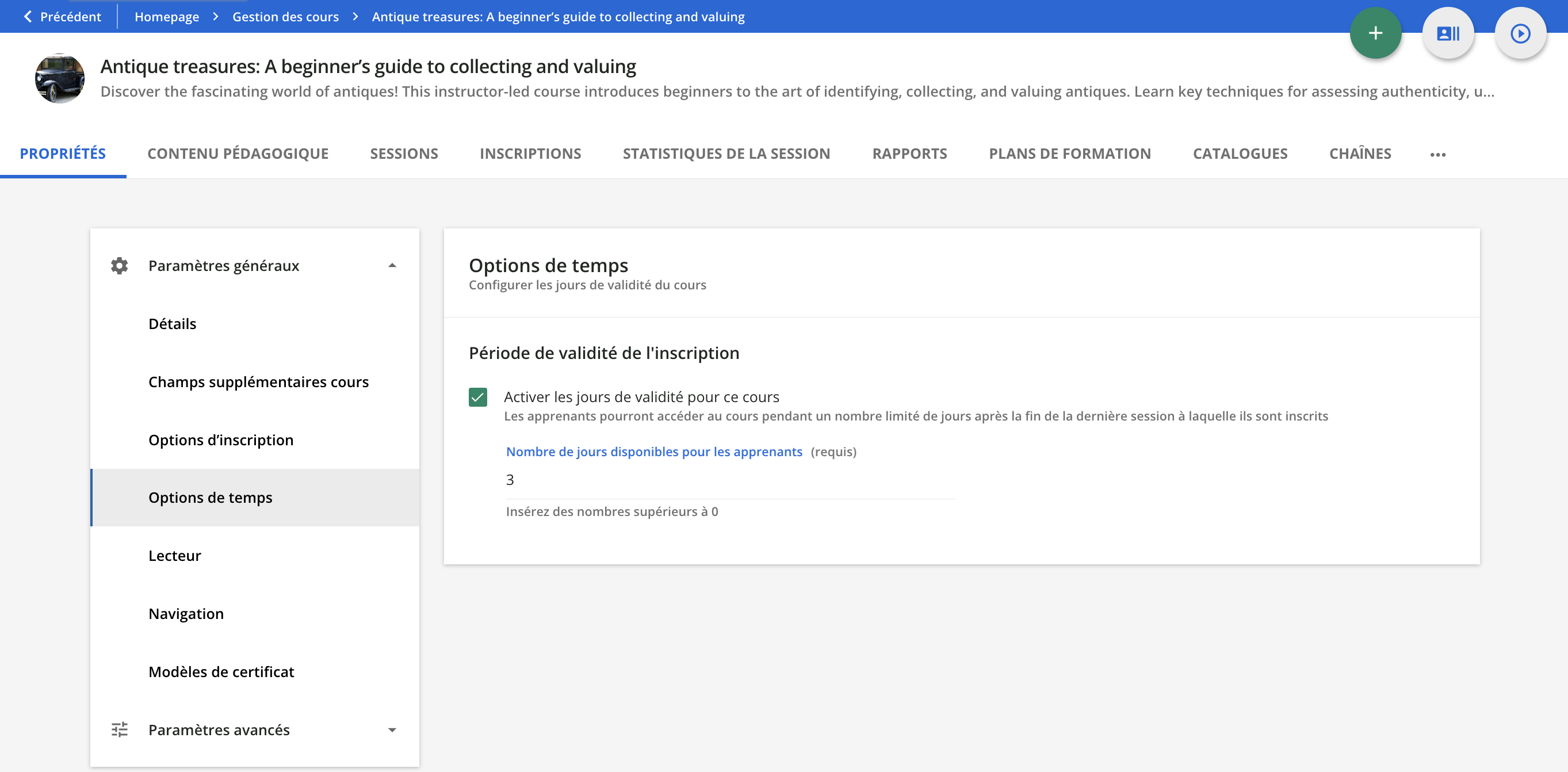 Sur la page principale de Gestion des cours, recherchez un cours dans la liste et cliquez sur sa description pour accéder à la page d’édition. Cliquez sur l’onglet Propriétés et allez sur l’onglet vertical Options temporelles.