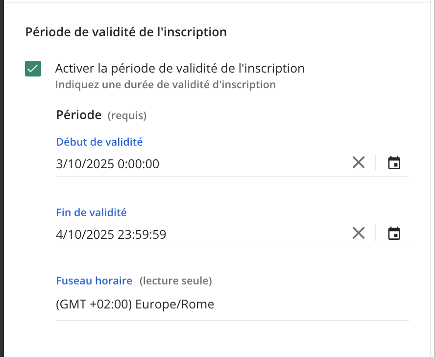 - Dans le panneau coulissant ouvert sur la droite, cochez la case Activer la période de validité de l'inscription, et dans la zone Période, saisissez les dates de Début de validité et de Fin de validité. Vous pouvez également omettre l'une des deux.