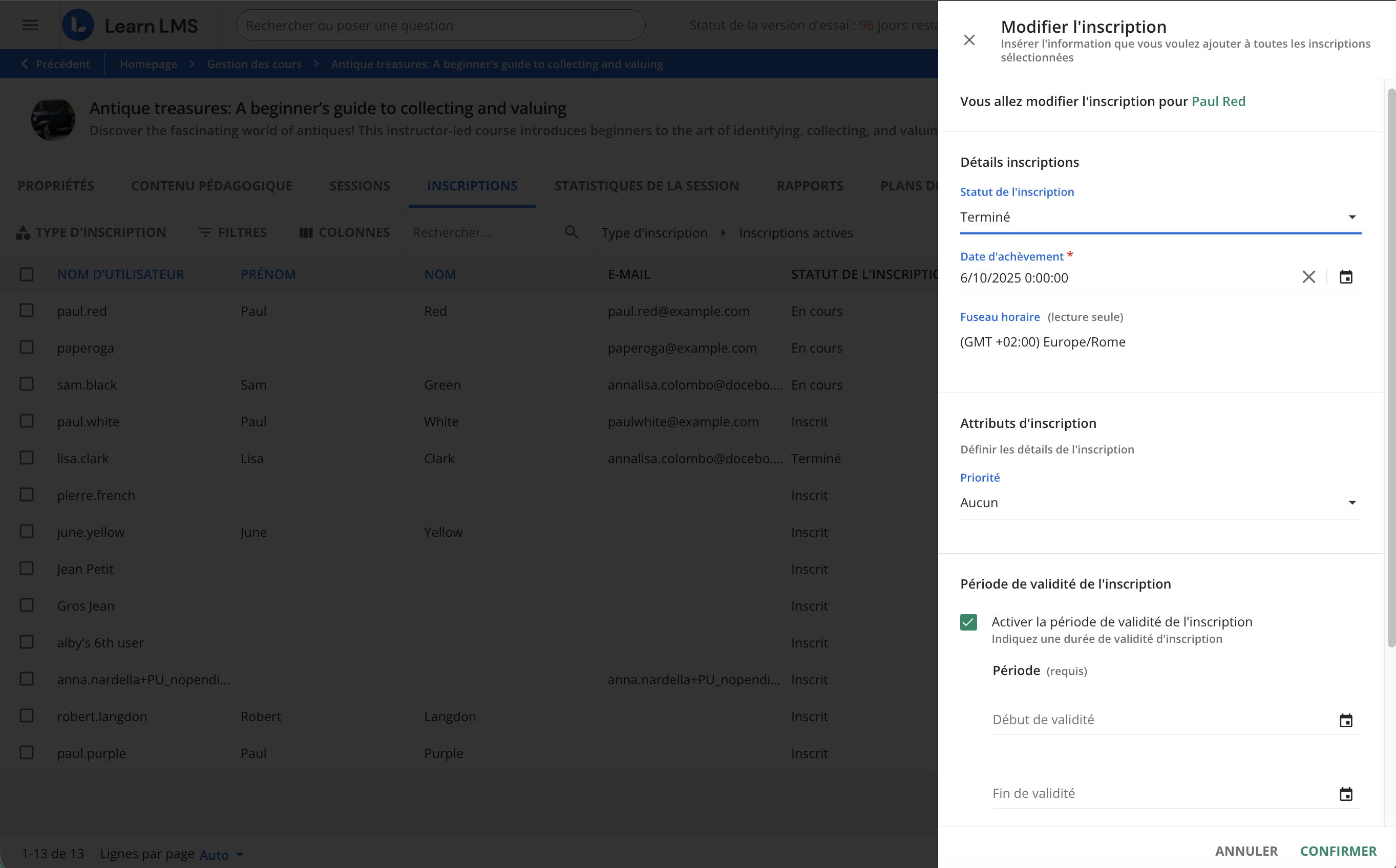 Pour définir manuellement la validité de l'inscription d'un apprenant :