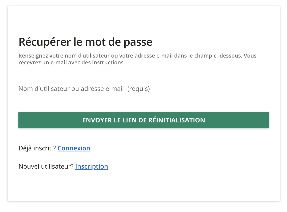 - Dans la fenêtre Récupérer le mot de passe qui s’ouvre, saisissez le nom d’utilisateur ou l’adresse e-mail correspondant à votre compte sur la plateforme, et sélectionnez Envoyer le lien de réinitialisation.