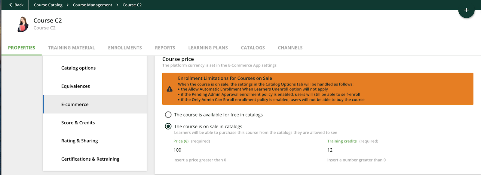 - Nella scheda Proprietà, seleziona Cataloghi e e-commerce, seleziona l'opzione Il piano di apprendimento è in vendita nei cataloghi, se non già impostata, e configura i prezzi desiderati in valuta e crediti di formazione.