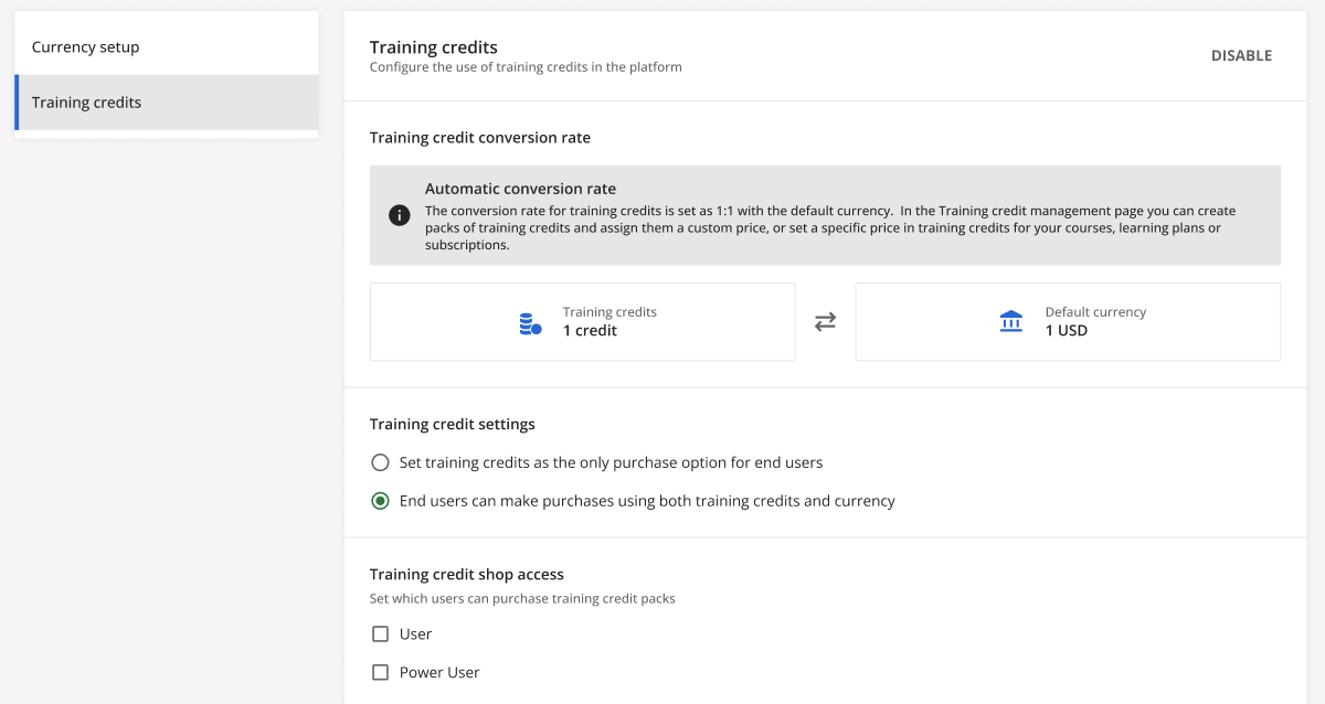Quando disabiliti i crediti di formazione, tutte le funzionalità correlate (come il negozio di crediti di formazione e il portafoglio di crediti di formazione) non saranno più disponibili sulla piattaforma.