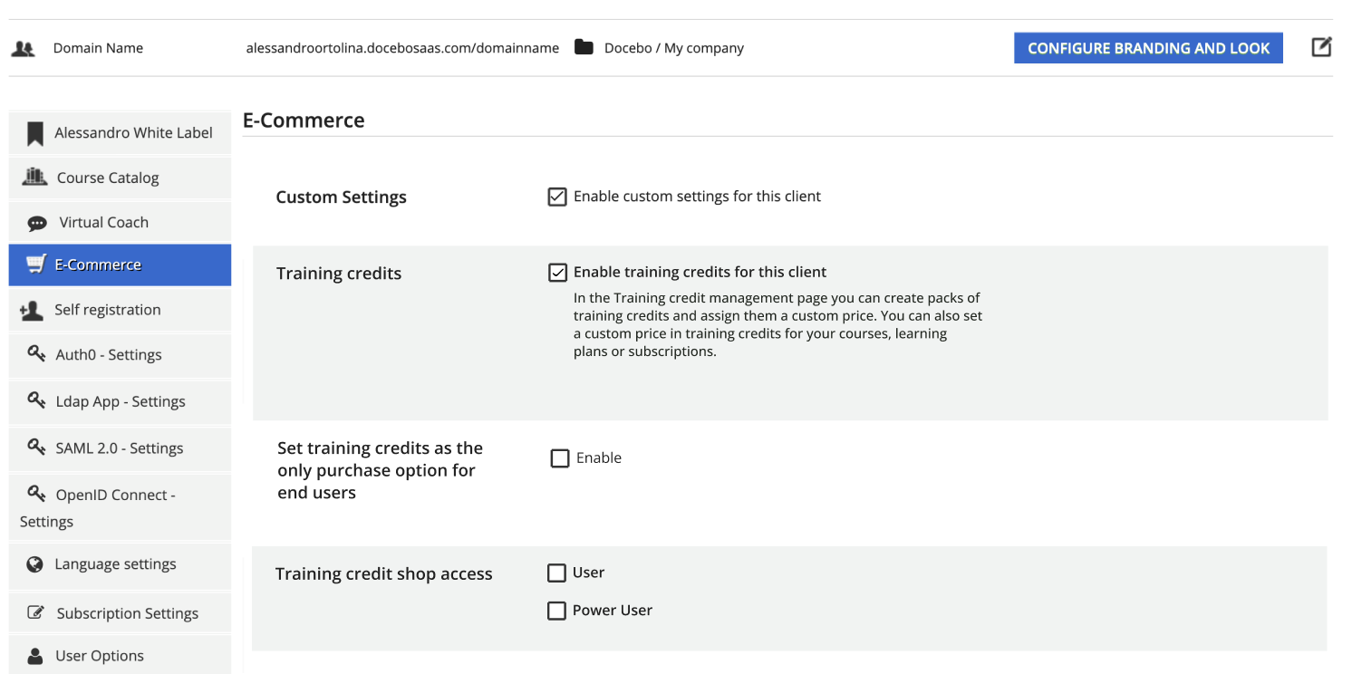 - Nella navigazione a sinistra fai clic su E-commerce, seleziona la casella di controllo Abilita impostazioni personalizzate per questo cliente, e poi deseleziona la casella di controllo Abilita i crediti di formazione per questo cliente.