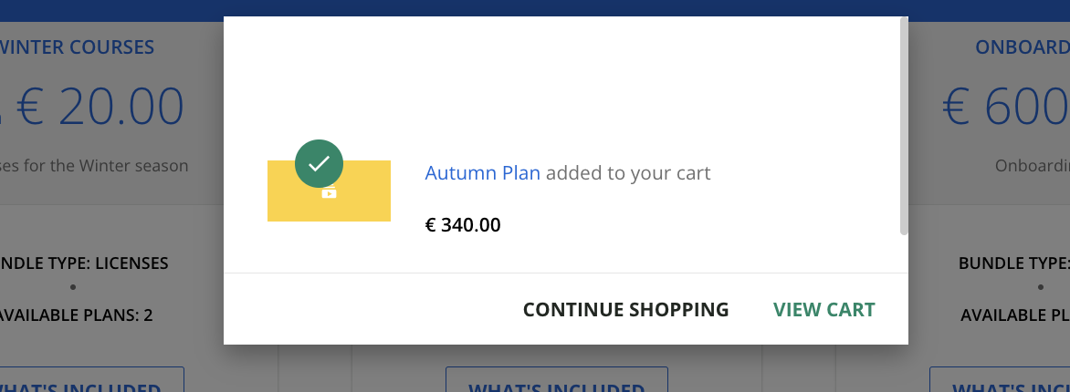 Selezionare l’opzione di acquisto desiderata e cliccare su Aggiungi al carrello. Poi cliccare su Visualizza carrello per procedere al carrello e completare il pagamento. Consultare l’articolo sul Carrello.