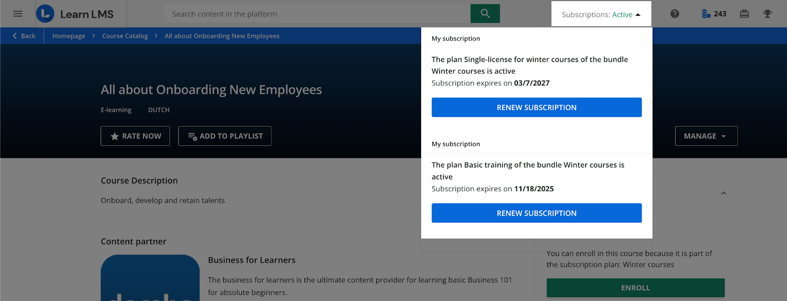 Un abbonamento comprende una raccolta di corsi e piani formativi, provenienti da uno o più cataloghi. Quando un utente si abbona, ottiene accesso a tutto il contenuto incluso per un periodo di tempo prestabilito, ad esempio un anno.
