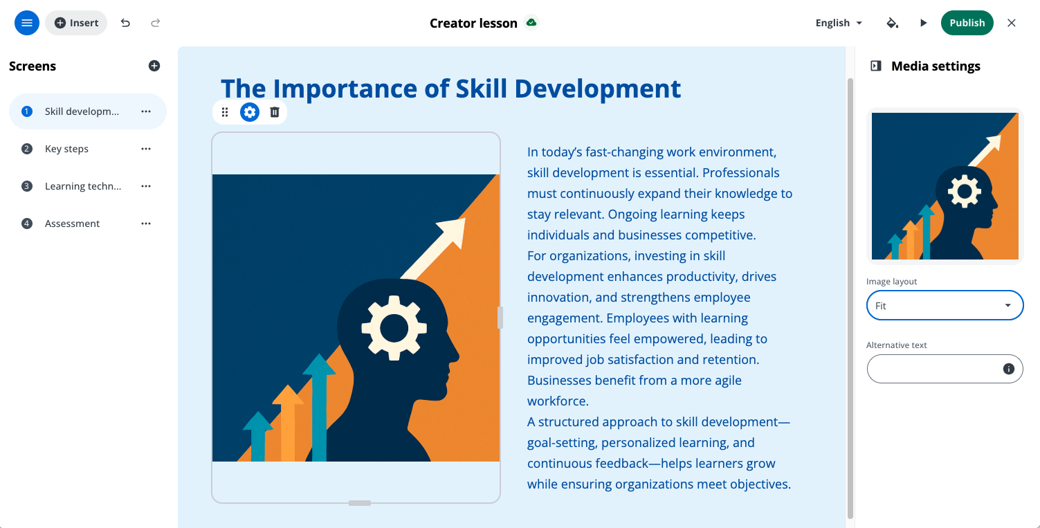 Per caricare immagini, video o file audio, cliccare su Insert e selezionare Media, quindi cliccare su Media library (Libreria multimediale). Nel pannello a scomparsa, è possibile caricare il proprio file o selezionarne uno caricato in precedenza. Controllare l'elenco dei file supportati per la libreria di Creator. Una volta caricato un file, se i tag automatici sono abilitati, l'intelligenza artificiale della piattaforma lo analizzerà e gli assegnerà dei tag, in modo da trovare facilmente i file multimediali cercando per tag oltre che per titolo.
