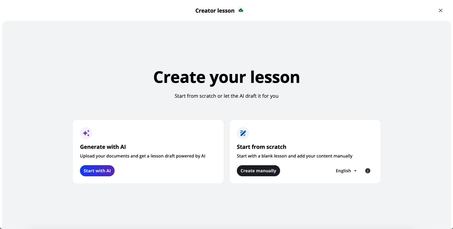 - Start with AI (Avvia con l'IA): è possibile lasciare l'IA creare la lezione al posto dell'utente in base ai documenti e alle richieste. Questa opzione è disponibile solo se le funzioni AI per Creator sono abilitate nel pannello di gestione dell'intelligenza artificiale .