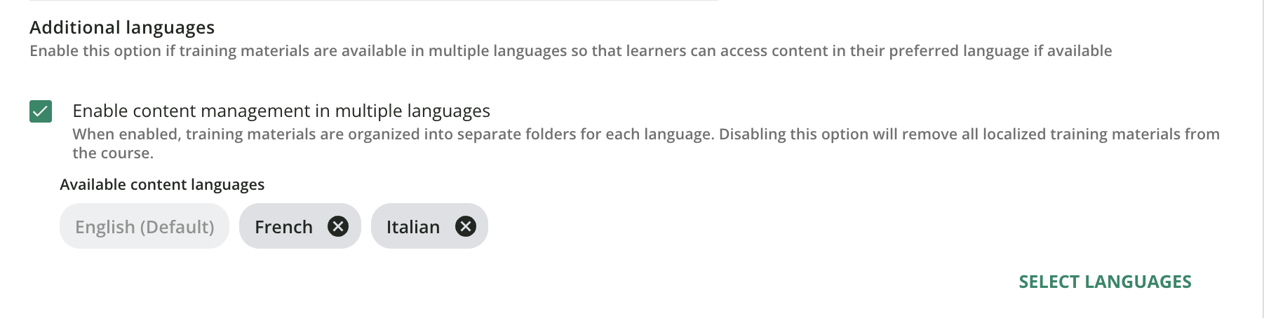 Disattivando l'opzione Abilita la gestione dei contenuti in più lingue, la piattaforma rimuoverà tutti i materiali didattici localizzati e le cartelle delle lingue dal corso. I materiali didattici al di fuori delle cartelle delle lingue verranno mantenuti.