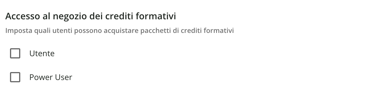 Un’altra alternativa è non vendere affatto pacchetti di crediti formativi. Si può ottenere questo risultato deselezionando sia Utente che Power User. In questo caso si possono comunque utilizzare i crediti formativi sulla piattaforma facendo sì che il Superadmin assegni crediti direttamente nei portafogli, rendendo così disponibili i crediti direttamente agli utenti, oppure ai Power User che possono amministrarli per i loro utenti.