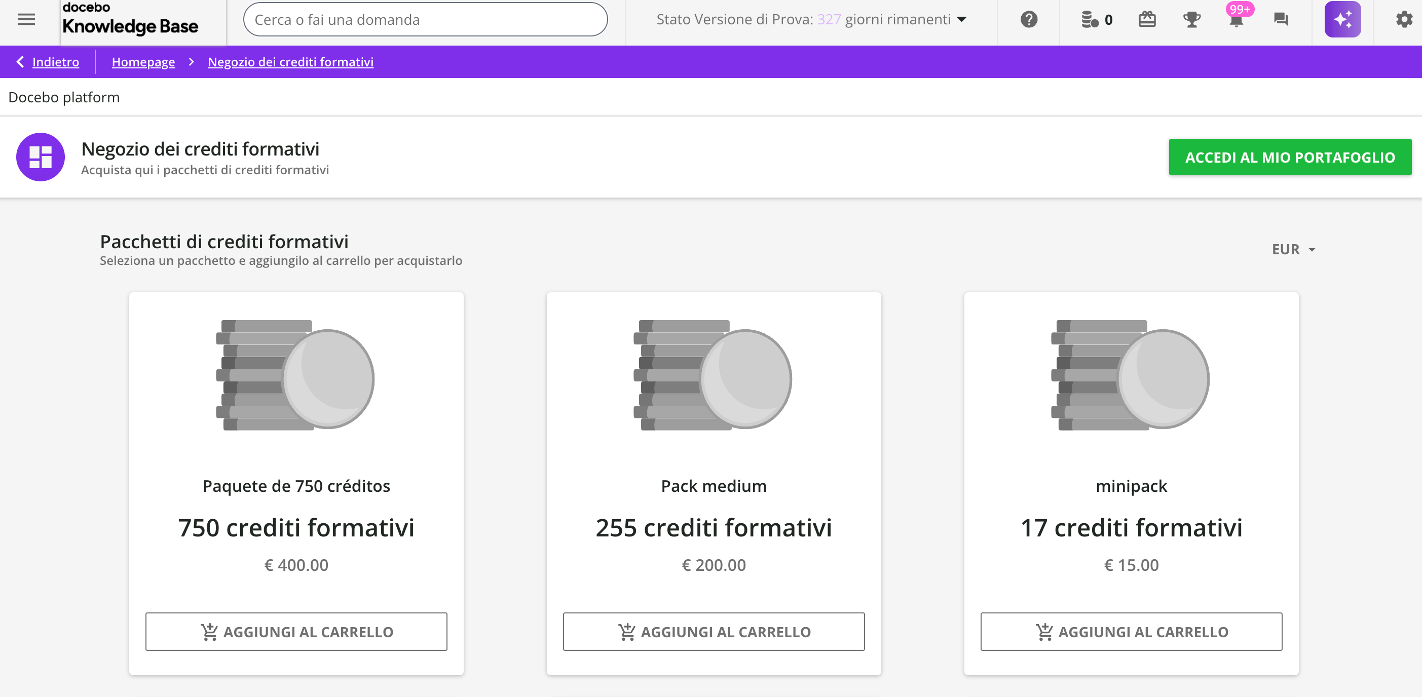 Sulle piattaforme dove sono abilitati i crediti formativi, è possibile configurare opzionalmente un negozio di crediti formativi, dove gli utenti possono acquistare “pacchetti” di crediti formativi per aggiungere un determinato numero di crediti ai loro portafogli.
