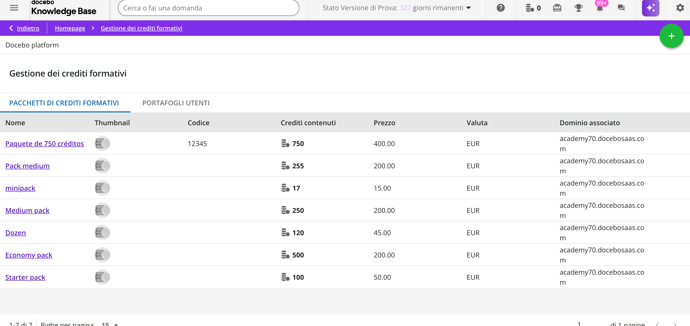 Si vedono elencati tutti i pacchetti di crediti formativi già creati sulla piattaforma, con colonne che indicano il numero di crediti, il prezzo, la valuta e (sulle piattaforme extended enterprise) il dominio associato. Da qui si può: