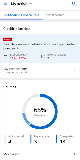 Per accedere alla pagina, selezionare icona menu > Le mie attività. La pagina è suddivisa in due sezioni principali: Certificazioni e corsi e Angolo social.