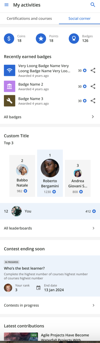 Classifiche: visualizza il podio di una classifica in evidenza insieme alla posizione attuale dell'utente. Selezionando Tutte le classifiche, è possibile accedere all'elenco completo delle classifiche disponibili. Per ciascuna classifica, è inoltre possibile scegliere Tutti i partecipanti per consultare la classifica integrale.
