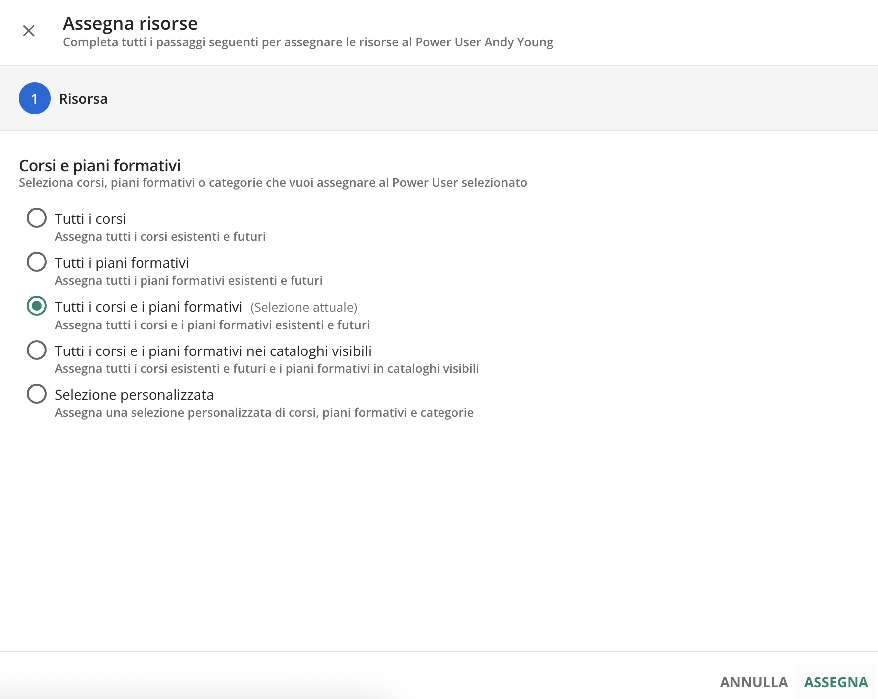 Quando si assegnano corsi e piani formativi come risorse a un Power User, è possibile effettuare una Selezione personalizzata (ovvero scegliere individualmente quali elementi assegnare) oppure selezionare una delle opzioni "Tutti i corsi", che assegnano al Power User tutti i contenuti esistenti e futuri del tipo specificato (corsi, piani formativi o entrambi).