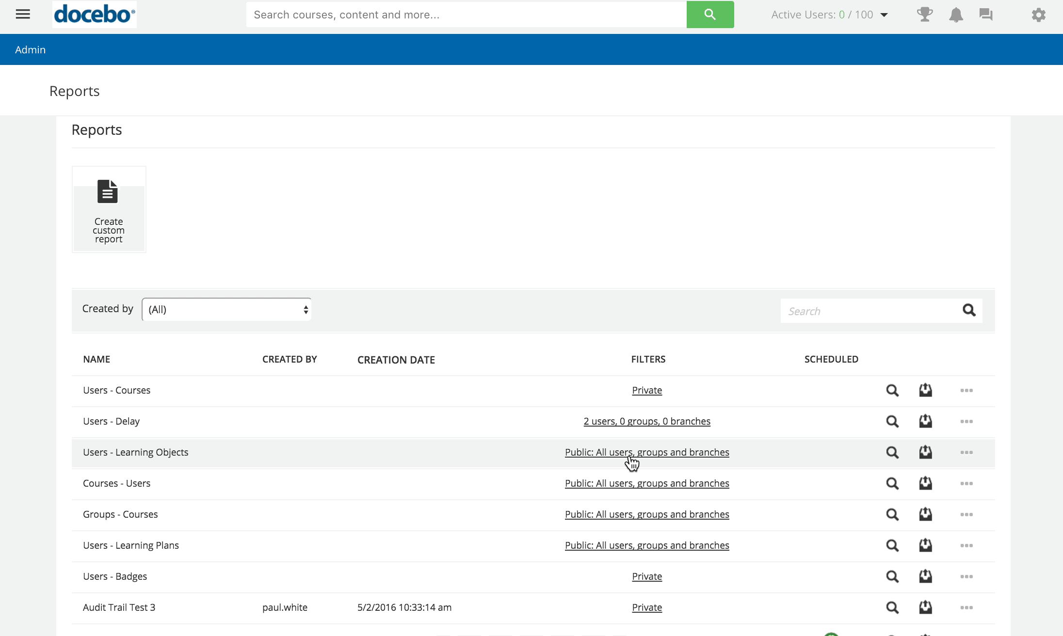 In piattaforma sono disponibili sei tipi di report standard, relativi a utenti, corsi, materiali didattici, gruppi e piani formativi. Per visualizzare e gestire un report predefinito, accedere alla piattaforma come Superadmin, quindi al Menu Amministrazione dall'icona ingranaggio in alto a destra. Nella sezione E-Learning, selezionare Report.