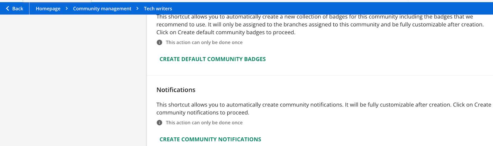 - Qui è possibile cliccare su Crea notifiche community per creare automaticamente il set di notifiche preconfigurate per questa specifica community. Se questa azione non è disponibile significa che è già stata eseguita in precedenza, e tali notifiche esistono già.