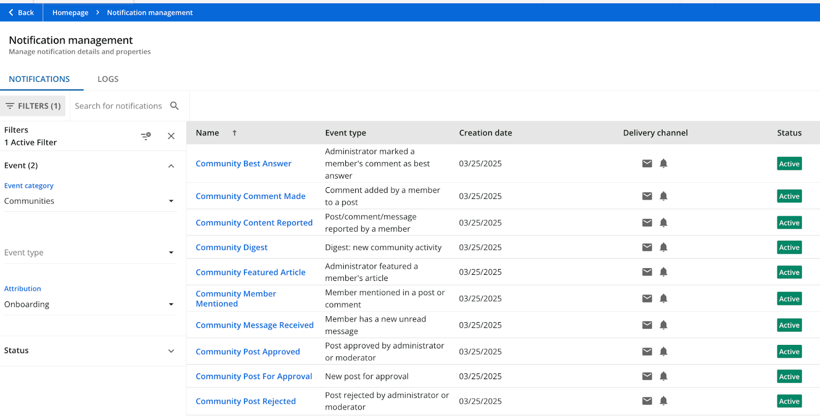 Nella pagina Gestione notifiche, è possibile trovare il set di notifiche della community create automaticamente filtrando per Categoria evento = Community e Attribuzione = <nome della community>.