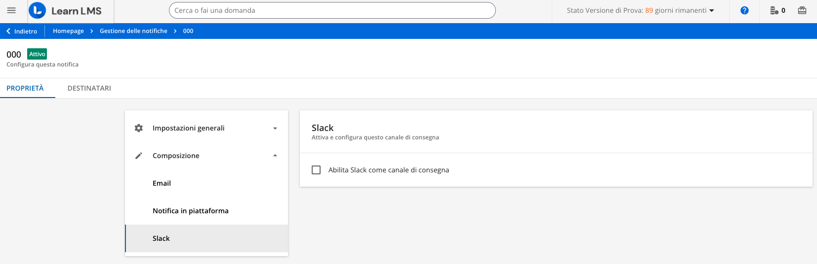 Per configurare questo canale di consegna, selezionare la scheda Proprietà > Composizione > Slack, e nel pannello a destra, selezionare la casella Abilita Slack come canale di consegna.
