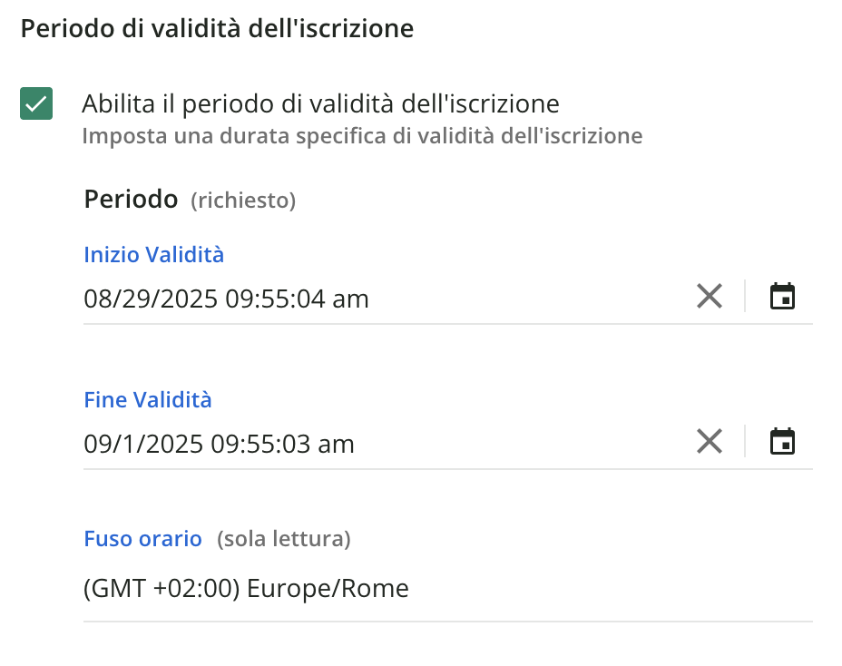 Quando si creano o modificano iscrizioni a un corso, si ha la possibilità di impostare un Periodo di validità dell'iscrizione (definito da una data di inizio e una di fine) per quegli utenti specifici. Questo permette di controllare quando gli utenti possono iniziare ad accedere al corso e fino a quando hanno accesso.