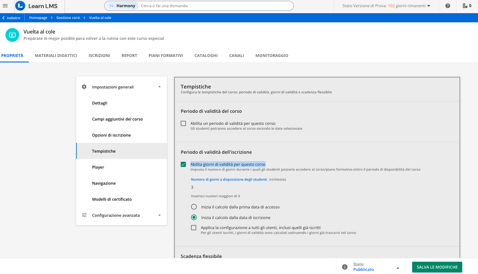 Nel caso dei corsi ILT (e VILT), dalla scheda Tempistiche puoi configurare solo un'opzione, il Periodo di validità dell'iscrizione.